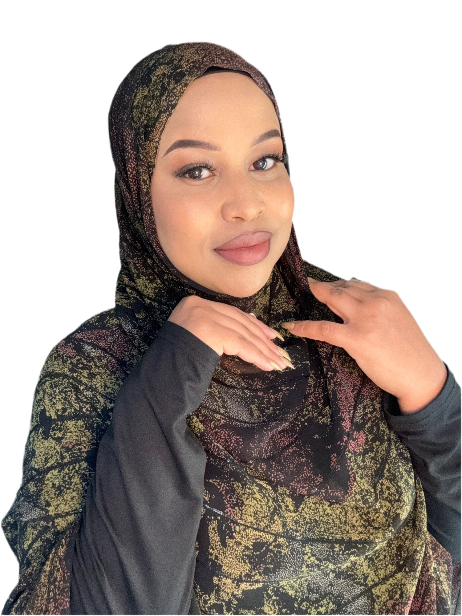 This printed hijab features a line of glitter, making it a stylish choice for any occasion. The material is lightweight yet provides excellent coverage, and its steady design ensures it stays in place. Enjoy a fashionable and comfortable fit with this printed hijab.