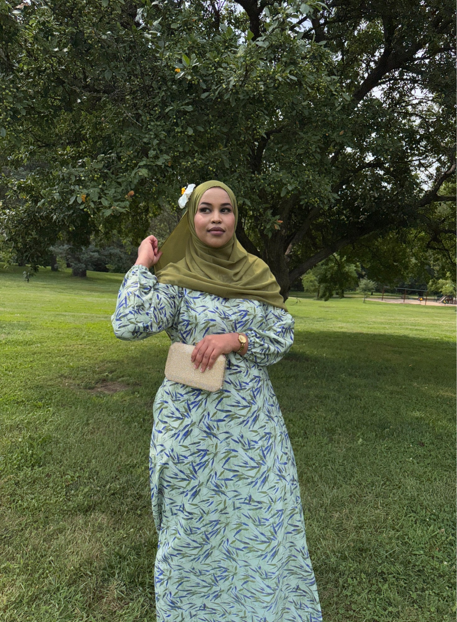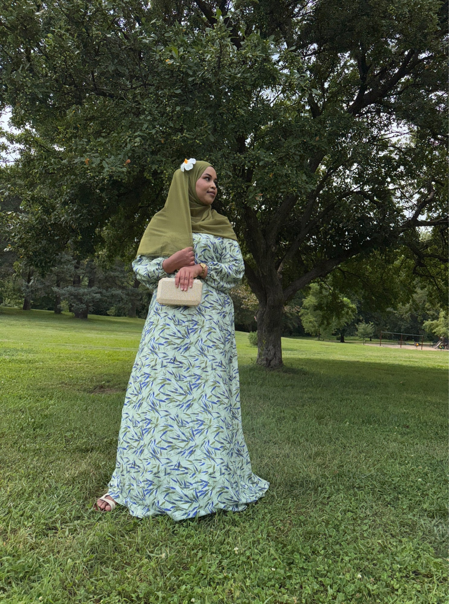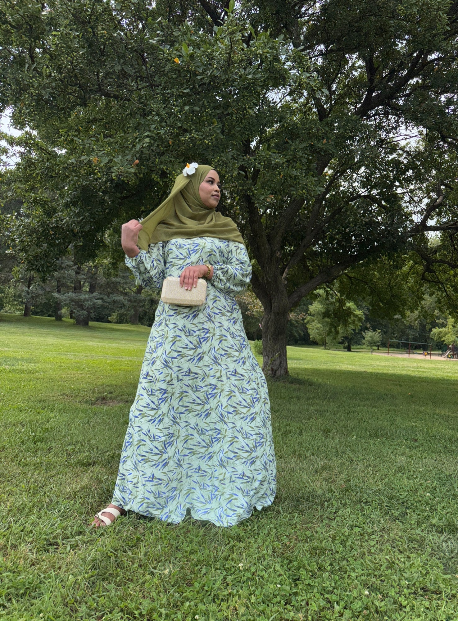 A lightweight, super soft green dress with a matching hijab, perfect for effortless elegance.